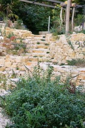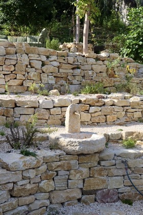 Mit Kalksteintrockenmauern terrassierter Südhanggarten von elf Meter Höhendifferenz und zwölf Meter langer Rutschbahn mitten im sonnigen Rebbergsteilhang, Sierre VS
