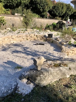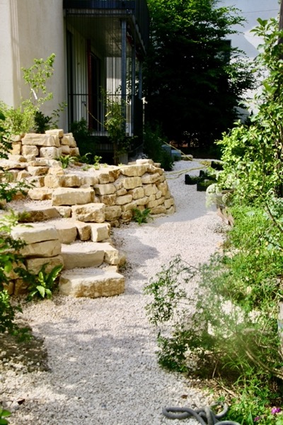 Gartenumgestaltung mit Rampe aus Kalksteinplatten für Veloanhänger, Täuffelen BE